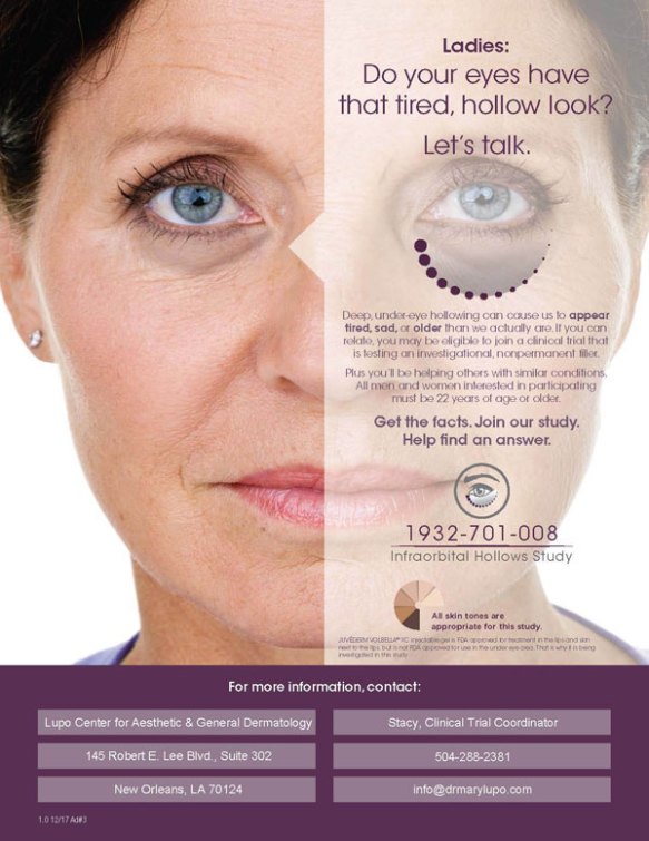 Currently Enrolling for an FDA Study on Under-Eye Hollowing Posted on March 14, 2018 by lupocenter Qualifying male or female participants who complete the study will receive $750 Share this: Share on X (Opens in new window) X Share on Facebook (Opens in new window) Facebook Like Loading... Related