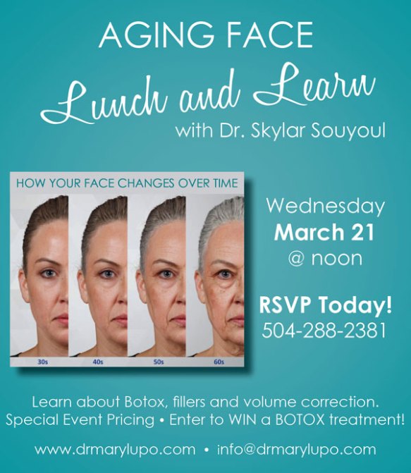 If you’re naïve to Botox and/or filler at our practice and interested in learning more about injectables, join us on Wednesday, March 21 at noon. Seating is very limited so RSVP today: 504-288-2381 or info@drmarylupo.com.