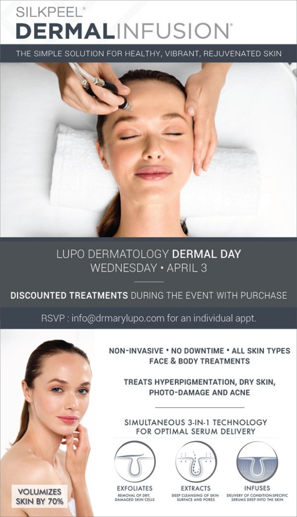 Join us on Wednesday, April 3, for a Dermal Day where you can learn more about SilkPeel Dermalinfusion, get treated and receive special event pricing on packages (Buy 5, Get 1 Free). RSVP: info@drmarylupo.com
