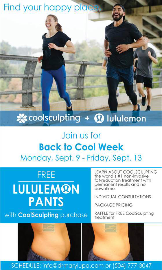 CALL TODAY: we are now scheduling complimentary CoolSculpting consultations with Dr. Lupo and Dr. Souyoul during our “Back to Cool” week, September 9-13. Call us for your individual consultation and to get your free Lululemon pants, while supplies last!