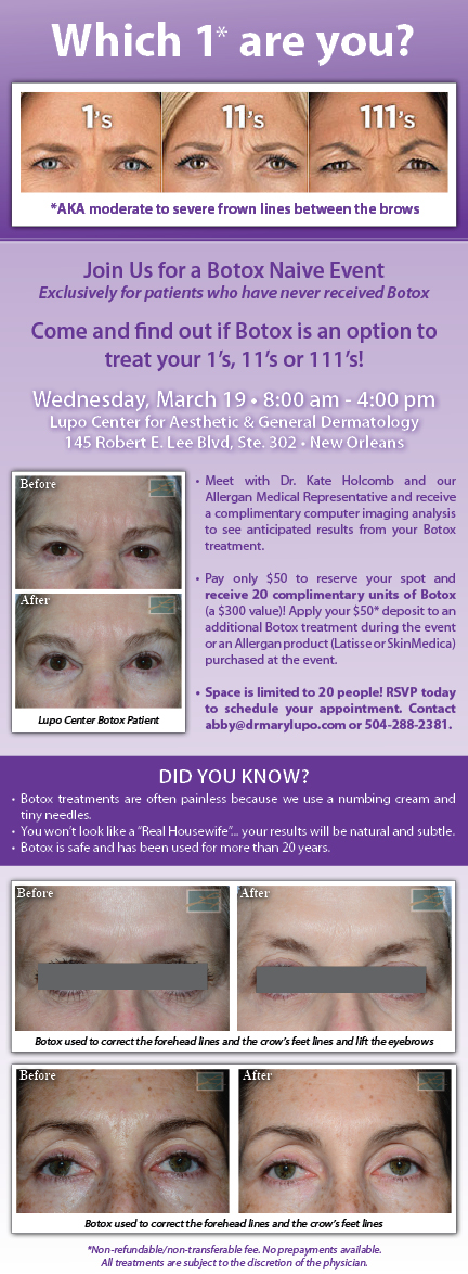 Contact us to learn more about this exciting Botox Loyalty Savings promotion or to schedule your Botox appointment: (504) 777-3047 or info@drmarylupo.com.