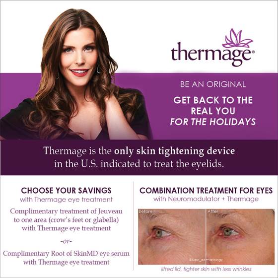For optimal results, it is best to receive the Jeuveau treatment within two weeks before or after the Thermage treatment. Thermage results usually take about 2-3 months for full effect, so get treated soon to have brighter eyes for the holidays!