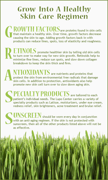 Below is the GRASS skin care guide to maintaining the best skin possible. Because we want to help our patients “grow” healthy skin, this month we are giving away one step in the GRASS skin care regimen. When you purchase three of the five steps in the GRASS (Growth factors, Retinols, Antioxidants, Specialty products and Sun protection) skin care regimen, you can receive a complimentary NEOCUTIS RéACTIVE Anti-oxidant Serum ($70.00 value). Available through April 30, 2014, while supplies last.