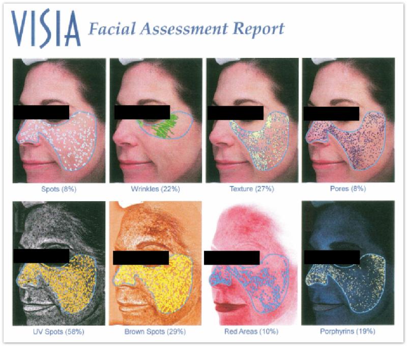The basis for this is a camera unit that sends high-quality photographs to a high-speed computer. The computer calculates both the standard and UV photos by means of the analysis software. With the VISIA analysis, we are able to provide the comprehensive data needed for an overall skin care rejuvenation plan based on your specific complexion requirements. The photographs and analysis take about 15 minutes. The VISIA screening is complimentary for all patients. Call today to schedule an appointment for a VISIA Complexion Analysis.